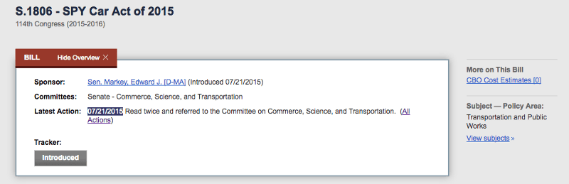 As reported here, this bill was introduced in July 2015, and executives from Google, General Motors, Delphi, and Lyft appeared before a US Senate committee on March 15 2015 to discuss it. The executives were asked whether there should be minimum standards for privacy and cybersecurity, and all but one participant declined to say yes or no. Since then, the bill has not been discussed further.