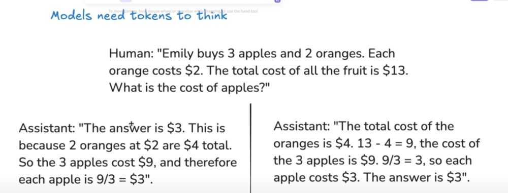 - The computation for getting each next token is finite. So you want the model to spread its computation over several models. That’s why in the below example option 1 is worse, because it provided the answer straight away then the rest is post-hoc justification